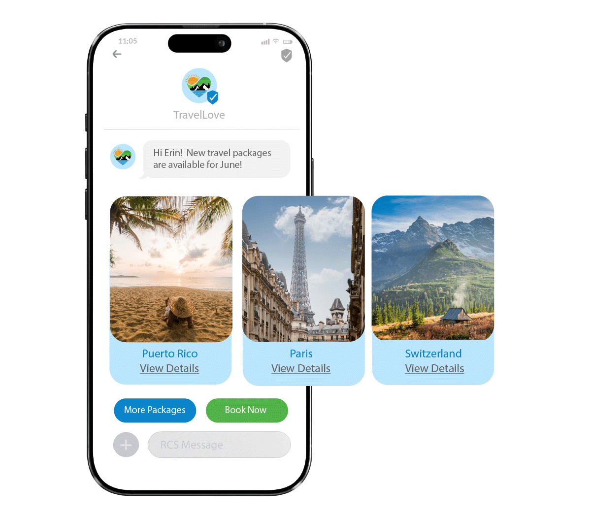 Send dynamic, personalized, rich media messages that outperform traditional SMS in every metric, including click-through rates, conversions, and customer satisfaction. With RCS, you’ll enjoy features like customizable CTA buttons, branded chats, and a verified sender badge that strengthens audience trust.